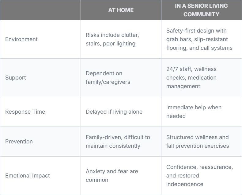 Bottom Line: Senior living communities provide a safer, more supportive environment than most private homes, especially for older adults at higher risk of falls.
